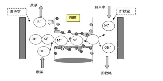 擴(kuò)散滲析回收廢堿與回收廢酸都是應(yīng)用了滲析原理,都是以濃差做推動(dòng)力的,不同的是用作擴(kuò)散滲析膜不是陰離子交換膜而是陽(yáng)離子交換膜。如下圖所示,在陽(yáng)離子均相膜的兩側(cè)分別通入廢堿液及接受液(自來水)時(shí),廢堿液側(cè)的堿及其鹽的濃度遠(yuǎn)高于水的一側(cè),因此由于濃度梯度的存在,廢堿及其鹽類有向擴(kuò)散室滲透的趨勢(shì),但膜是有選擇透過性的,它不會(huì)讓每種離子以均等的機(jī)會(huì)通過,首先陽(yáng)離子交換膜骨架本身帶負(fù)電荷,在溶液中具有吸引帶正電水化離子而排斥帶負(fù)電荷水化離子的特性,故在濃度差的作用下,廢堿側(cè)的陽(yáng)離子被吸引而順利地透過膜孔道進(jìn)入水的一側(cè)。同時(shí)根據(jù)電中性要求,也會(huì)夾帶帶負(fù)電荷的離子,由于OH-的水化半徑比較小,電荷較少;而其它陰離子離子半徑較大,因此OH-會(huì)優(yōu)先通過膜,這樣廢液中的堿就會(huì)被分離出來。