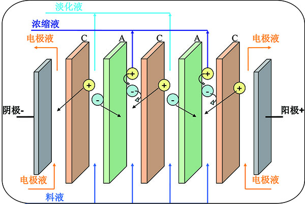 電驅(qū)動(dòng)膜分離器由隔板、電驅(qū)動(dòng)膜、電極、夾緊裝置等主要部件組成。電驅(qū)動(dòng)膜對(duì)不同電荷的離子具有選擇透過性。陽(yáng)膜只允許通過陽(yáng)離子,阻止陰離子通過;陰膜只允許通過陰離子,阻止陽(yáng)離子通過。在外加直流電場(chǎng)的作用下,水中離子作定向遷移。由于電驅(qū)動(dòng)膜分離器是由多層隔室組成,故淡室中陰陽(yáng)離子遷移到相鄰的濃室中去,從而使含鹽水淡化。